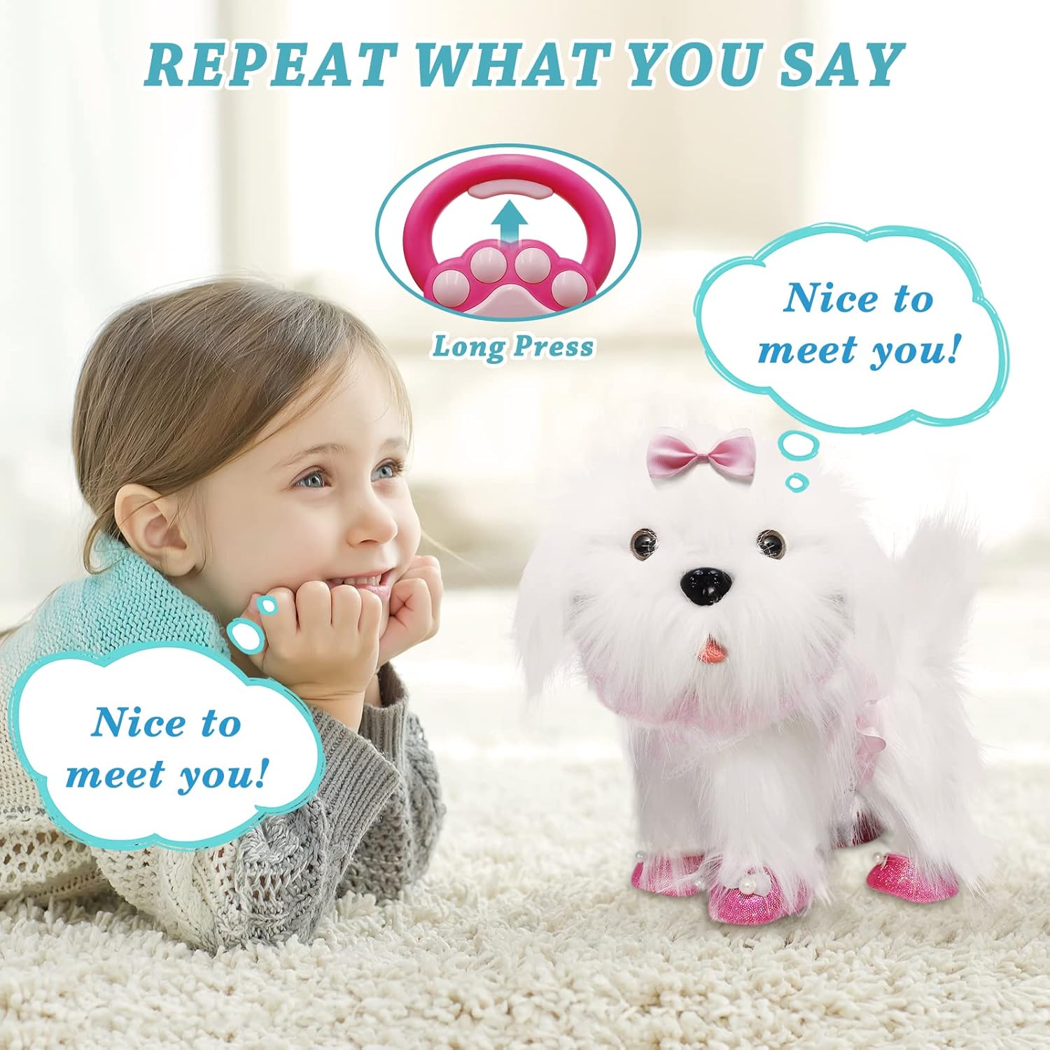 - 【 Lick & bark 】We innovatively added the tongue-licking function. This is something other toy dogs don’t have. After gently touching the head or slapping the palm on the head, the toy dog can lick your hand or lick your leg gently. It is very similar to the experience of a real dog licking its tongue; It is equipped with five kinds of barking sounds, including the common “wang, wang” “ao~ao~” “woof, woof” and the tongue-sticking voice “hahaha” and the coquetry-voice “ao~wang wang”