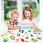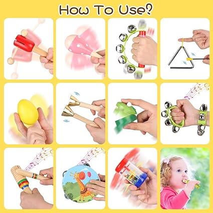 - ♬[Musical Educational Toys] 23 different kinds of musical instrument toys, including 1 Tambourine, 4 Shaker Egg, 2 Maracas, 2 Wrist Bell, 1 Hand Bell, 3 Cartoon Whistle, 2 Bell Stick, 1 Tone Block, 1 Shook Tube, 2 Castanets, 1 Rain Maker, 1 Triangle with Striker, 1 Drawstring Bag